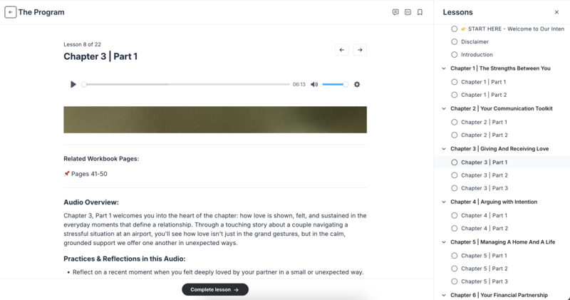 That’s more common than you think. Start by listening to the welcome recording together—it’s short, story-driven, and often enough to help both partners feel more engaged and curious. This isn’t about homework. It’s about creating space for conversations that matter.
